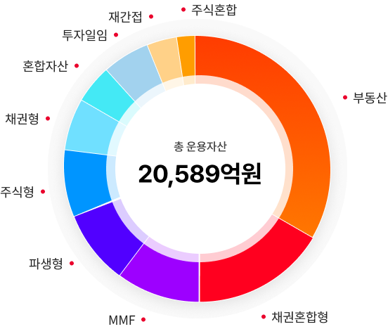 | 유형 | 주식형 | 주식혼합형 | 채권혼합형 | 채권형 | 재간접 | 투자일임 | 파생형 | 부동산 | 혼합자산 | MMF |